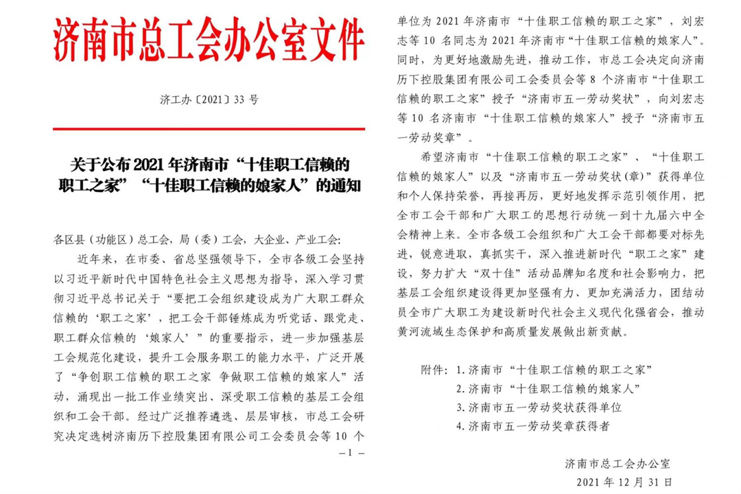 為激發(fā)基層工會活力,濟南市總工會開展“爭創(chuàng)十佳職工信賴的職工之家 爭做十佳職工信賴的娘家人”活動。12月31日,濟南市總工會公布2021年度濟南市“十佳職工信賴的職工之家 十佳職工信賴的娘家人”名單,濟南長田實業(yè)有限公司工會委員會榮獲2021年度濟南市“十佳職工信賴的職工之家”稱號。