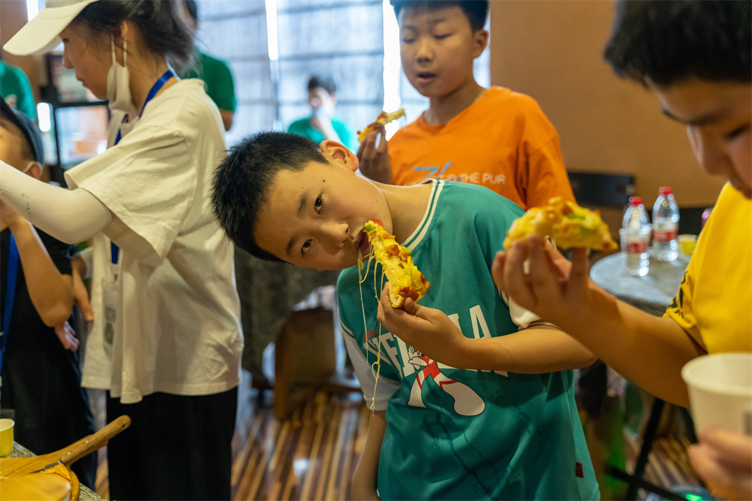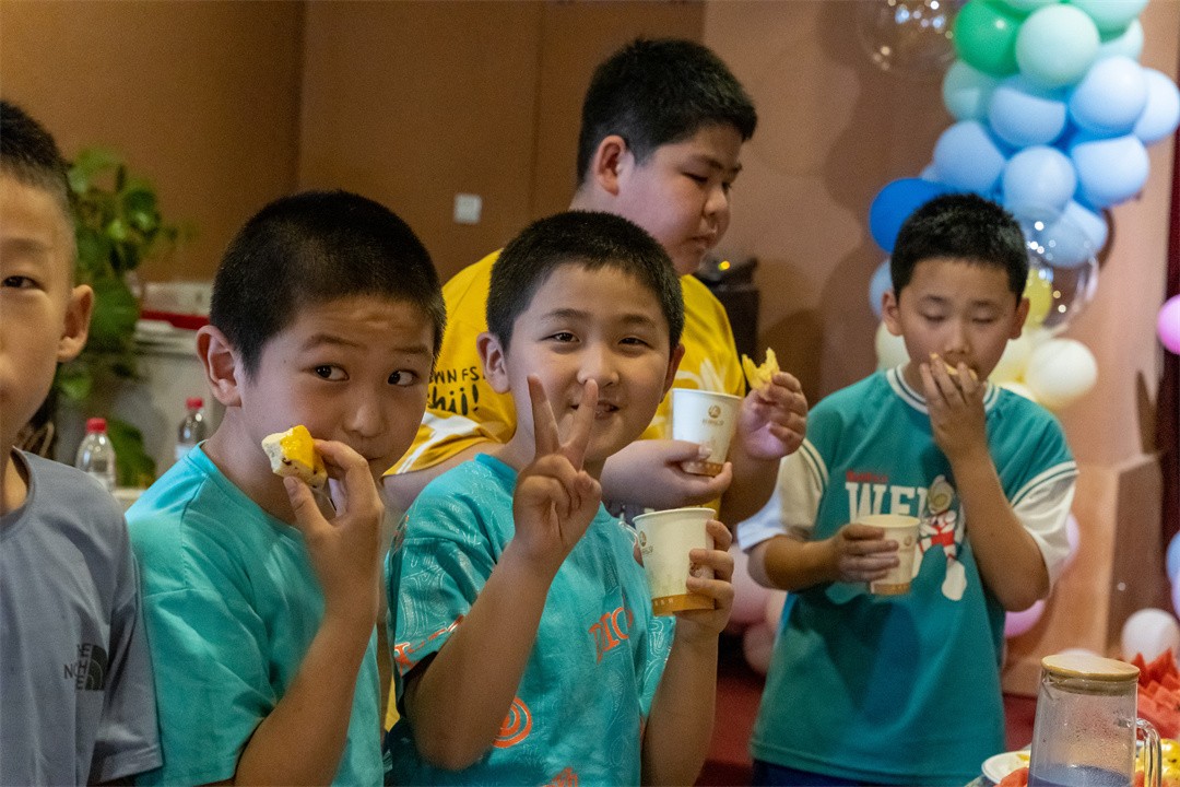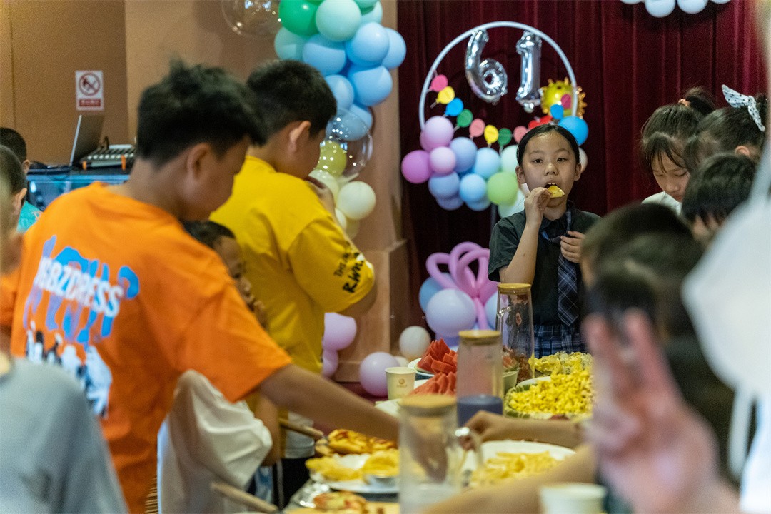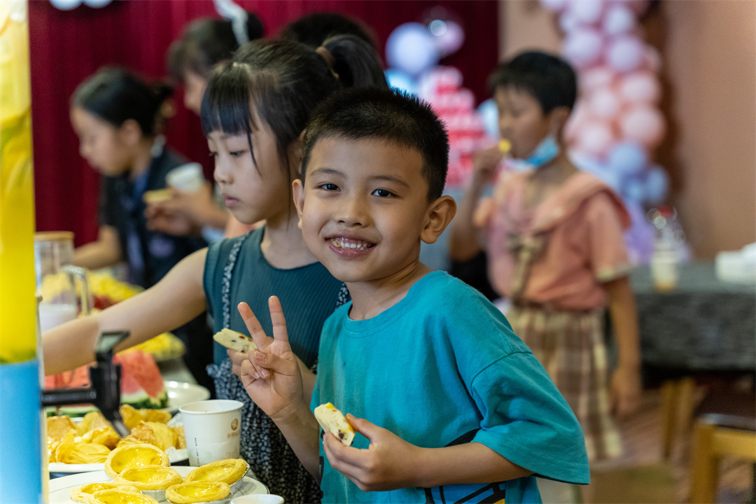 公司為孩子們準(zhǔn)備的美食、飲品與水果,擺滿了長長的桌子。美味的披薩、司康、蛋撻、薯?xiàng)l讓孩子們目不暇接,奶茶、水果飲品前,孩子們拿著自己的小杯子自覺排隊(duì)選擇自己喜歡的口味……