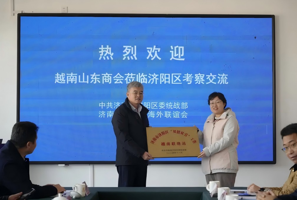 座談會上,王部長為越南中國商會山東企業(yè)聯(lián)合會頒發(fā)“濟南市濟陽區(qū)‘雙招雙引’工作越南聯(lián)絡(luò)站”站牌。