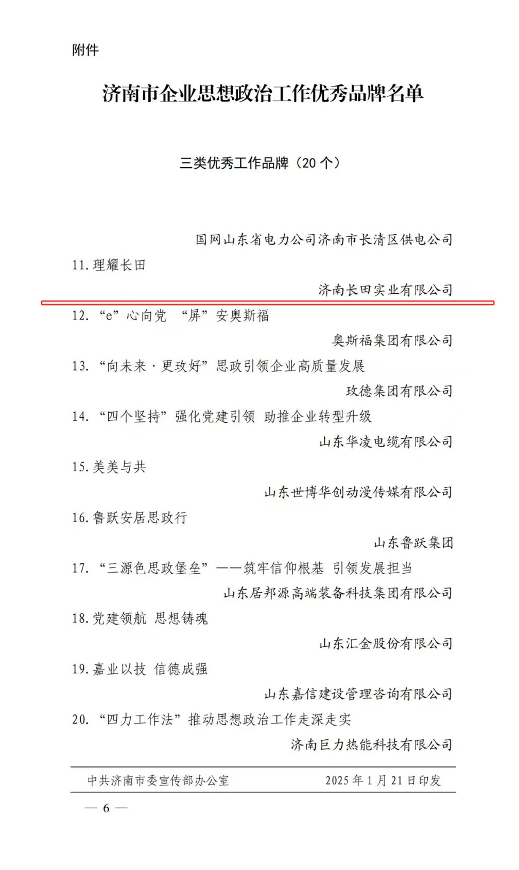 立高山之巔,方見大河奔涌;于群峰之上,更覺長風(fēng)浩蕩。長田實(shí)業(yè)將以黨建為引領(lǐng),不忘初心、砥礪前行,夯實(shí)思想之基、提升行動(dòng)之力,凝心聚力打造富有長田特色的思想政治工作品牌,使“理耀長田”的品牌力量更加深入人心。展望未來,我們將繼續(xù)推動(dòng)企業(yè)思想政治工作品牌走深走實(shí),不斷探索和創(chuàng)新思想政治工作的方法和手段,加強(qiáng)與其他企業(yè)的交流與合作,努力將公司思想政治工作品牌打造成為具有廣泛影響力的知名品牌,助力推動(dòng)全市企業(yè)思想政治工作的開展和創(chuàng)新,為加快建設(shè)“強(qiáng)新優(yōu)富美高”新時(shí)代社會(huì)主義現(xiàn)代化強(qiáng)省會(huì)貢獻(xiàn)長田力量。