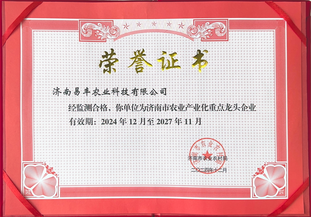 易豐農(nóng)業(yè)被授予濟(jì)南市第十八批農(nóng)業(yè)產(chǎn)業(yè)化重點(diǎn)龍頭企業(yè)、濟(jì)南市十佳巾幗現(xiàn)代農(nóng)業(yè)科技基地;成功入選濟(jì)南市“萬企興萬村”行動實(shí)驗(yàn)項(xiàng)目名單;2024年,被認(rèn)定為科技型中小企業(yè),并獲得市級專家服務(wù)基地、市級農(nóng)民田間學(xué)校認(rèn)證。