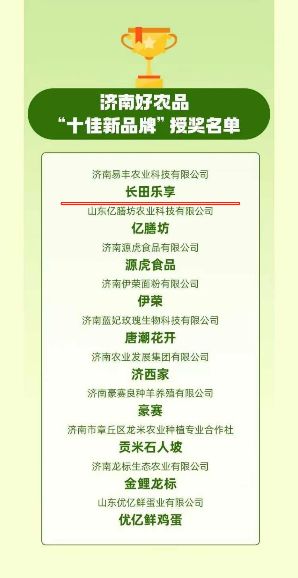 3月31日,首屆“濟(jì)南好農(nóng)品”品牌評選結(jié)果正式揭曉,在濟(jì)南市農(nóng)業(yè)農(nóng)村局指導(dǎo)、市農(nóng)業(yè)產(chǎn)業(yè)協(xié)會主辦的這項(xiàng)權(quán)威評選活動中,長田樂享谷物超鮮蛋從眾多參評企業(yè)中脫穎而出,成功入選“十佳新品牌”。這標(biāo)志著政府及市民對長田樂享品質(zhì)的高度認(rèn)可。
