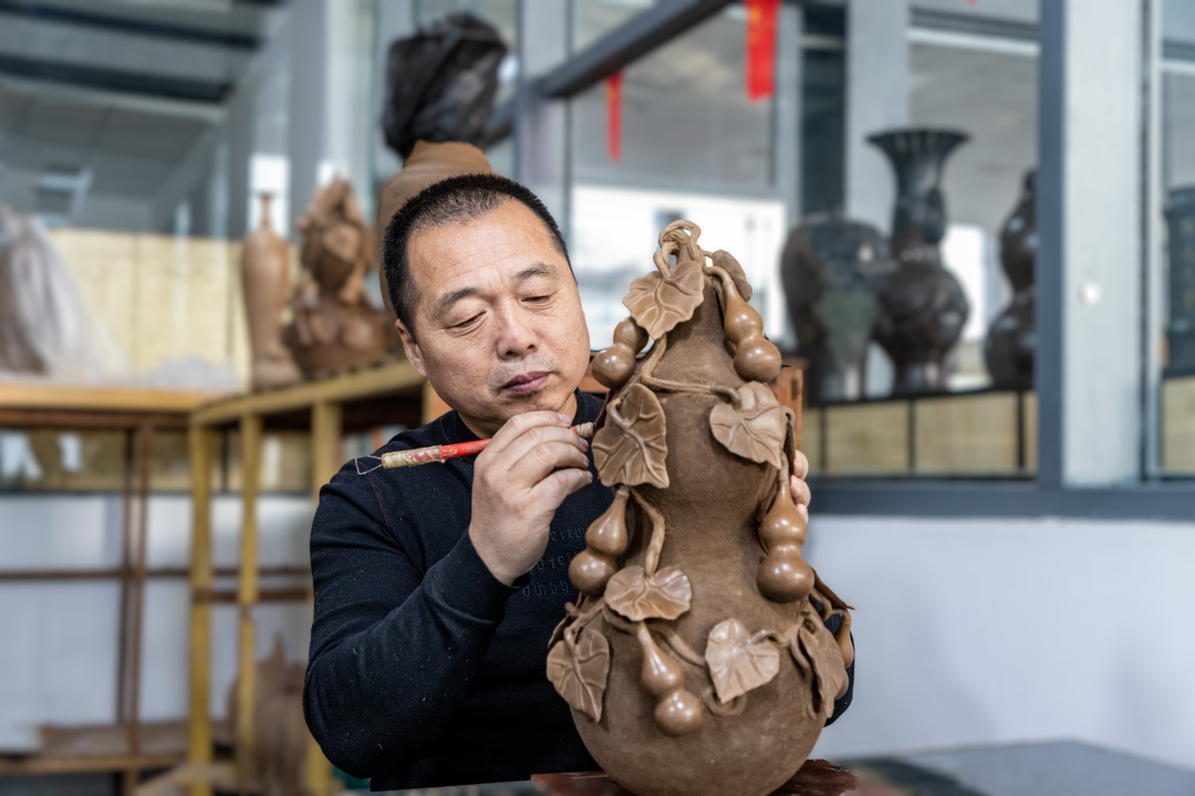 黑陶是華夏先民的黑色詩篇,作為土生土長的濟陽人,三十余載光陰里,徐慶增潛心研究黑陶,續(xù)寫這光輝的詩篇。如今,他的作品早已超越實用范疇,成為兼具藝術(shù)價值與文化厚度的非遺名片?!洱堯v盛世》以華夏龍為魂,將泥與火的淬煉推向極致。《福壽葫蘆》造型圓潤飽滿,釉色沉郁如墨玉,無需多言,一抹玄色間,福氣已悄然落定。《鼓子秧歌》則將田間地頭的歡騰瞬間凝固于陶面,讓人仿佛聽見咚咚的鼓點,看見祖輩們在黃河邊舞出的煙火人間。這些凝聚著心血的創(chuàng)作,不僅是他個人的藝術(shù)成就,更成為高校非遺教學(xué)中鮮活的教材。